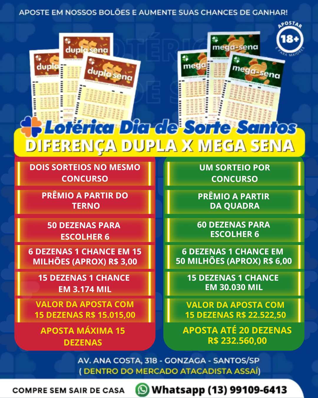Todas as apostas oferecidas pela Lotérica Dia de Sorte - Santos são autorizadas pela CAIXA. Jogue com segurança sempre!