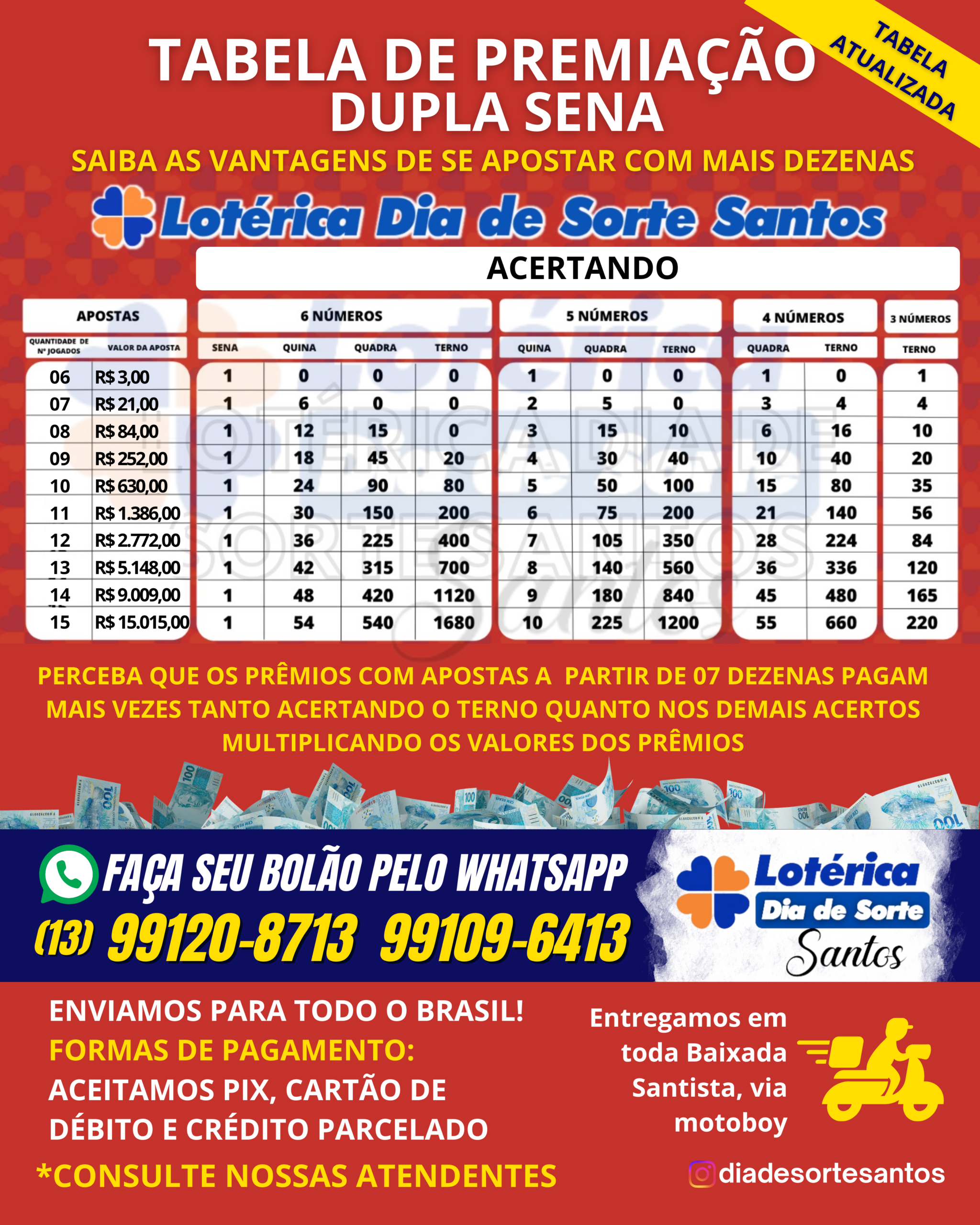A Dupla Sena possui dois sorteios por concurso, ou seja, com apenas uma aposta o apostador tem dupla chance de ganhar. Ganha quem acertar 3, 4, 5 ou 6 números em qualquer um dos dois sorteios. O apostador escolhe de 6 a 15 números dentre os 50 possíveis.