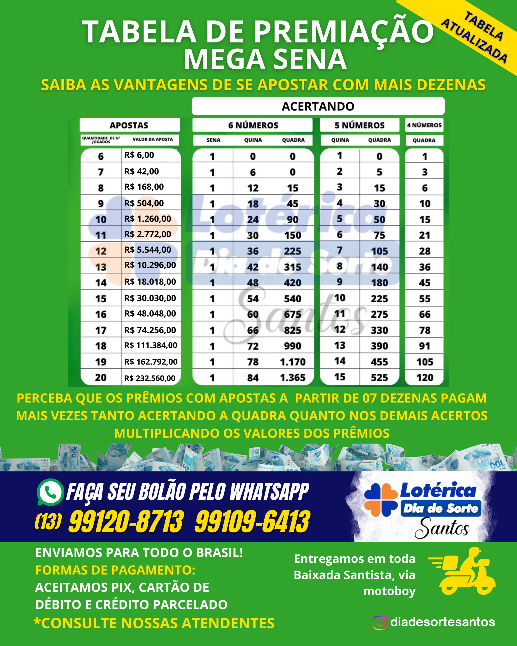 A Mega-Sena é a loteria que paga os maiores prêmios, por isso não dá para perder a oportunidade de participar. A Mega possui três faixas de premiação e o apostador pode jogar de 6 a 20 dezenas e ganha acertando 4, 5 ou 6 dezenas, por isso, quanto mais dezenas apostar, mais chances de ganhar, como mostra a tabela.